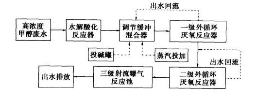 以上流程中我们广东污水处理公司均要在水解酸化反应器和两级厌氧系统进行污泥接种和驯化,经过如上图所示流程,高浓度甲醇废水均能得到良好的净化,其中水解酸化反应器的COD 去除率在25 %左右,两级厌氧系统的去除率可达90 %~92.5%。